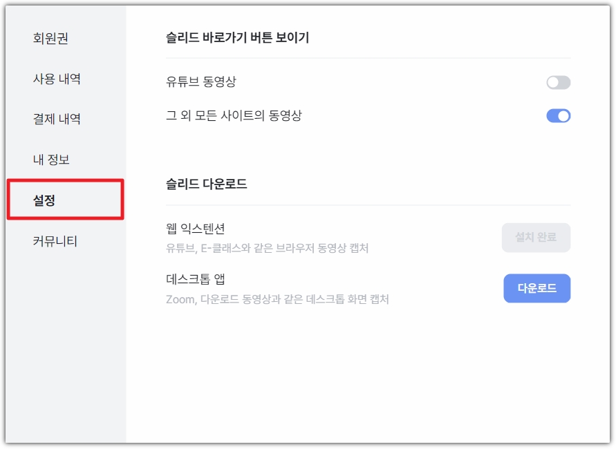 5) 슬리드 메인 페이지 들어가기 → 왼쪽 상단 설정 클릭하기