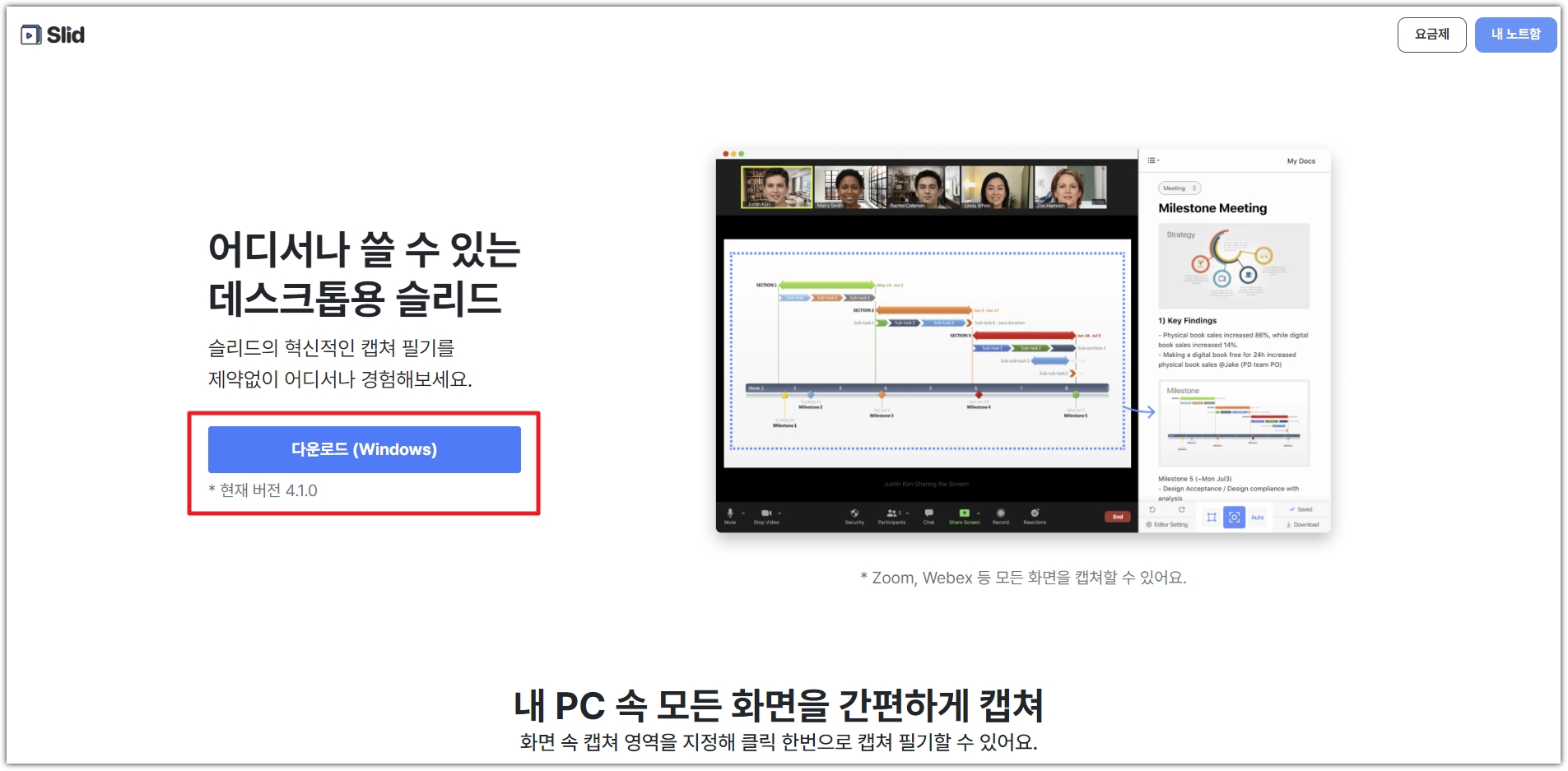 >>> 데스크톱 앱을 다운로드하면 구글 맨 오른쪽 상단에 다운로드된 파일 Slid+Setup+4.1.0.exe를 클릭하여 실행합니다.