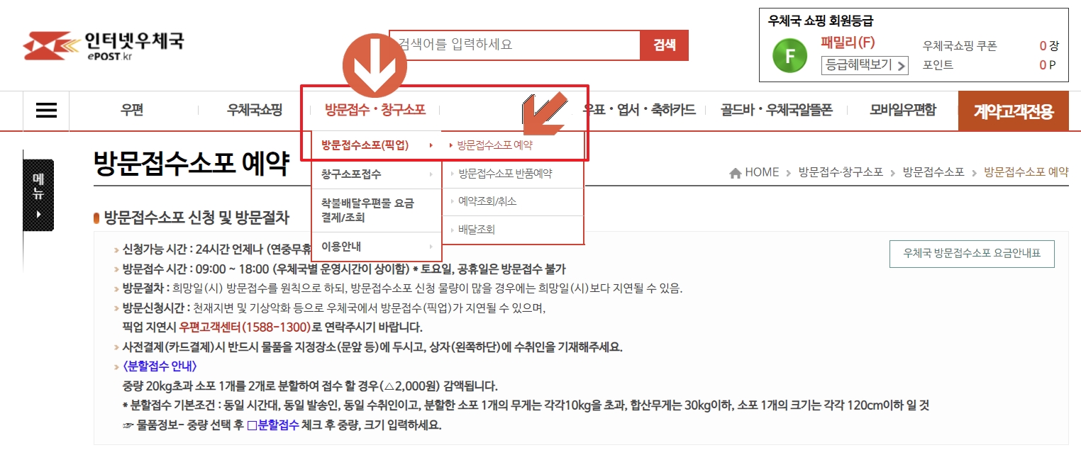 3) 우체국 홈페이지 접수 하기: 방문접수, 창구소포 → 방문접수소포(픽업) → 방문접수소포예약