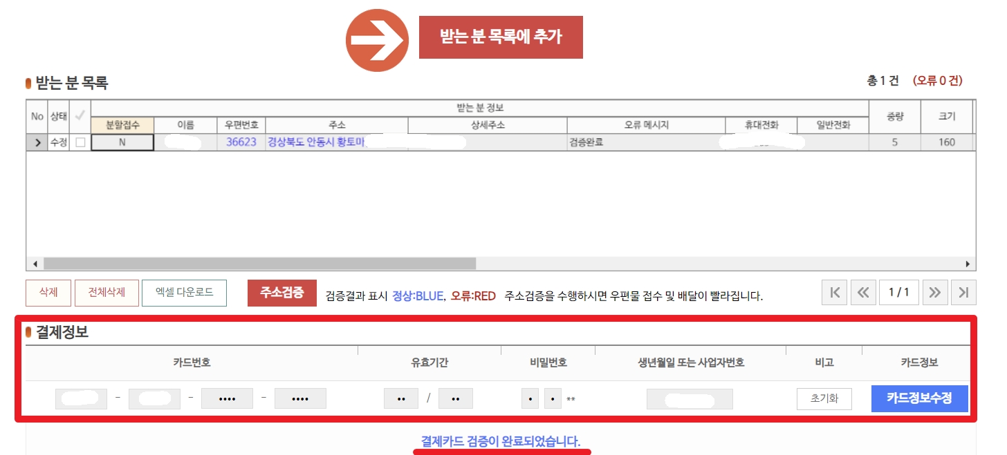 5) 접수 등록 하기: 받는 분 정보 입력 → 받는 분 몰록 추가 → 결재정보 입력
