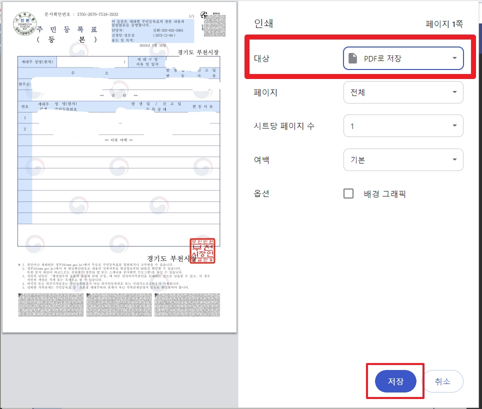 ○ 주민등록표 출력 방법은 프린트로 할 수 있고 PDF로도 할 수 있습니다.