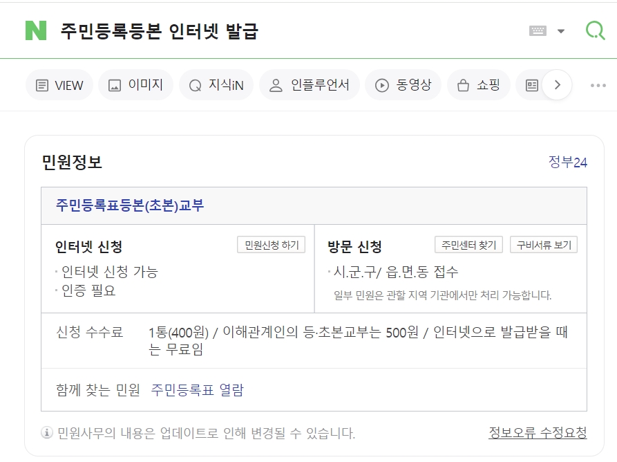주민센터 직접 방문 시에는 1통당 400원의 수수료가 발생하지만,
