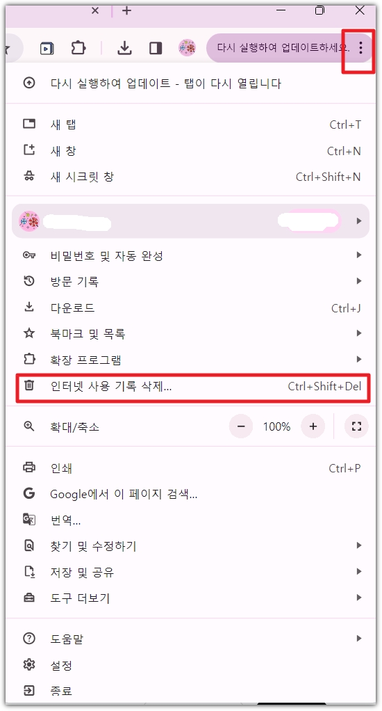 >>> 크롬의 인터넷 사용정보를 삭제하려면 Chrome을 열고 화면 오른쪽 상단에 있는 세 개의 수직 점을 클릭합니다.