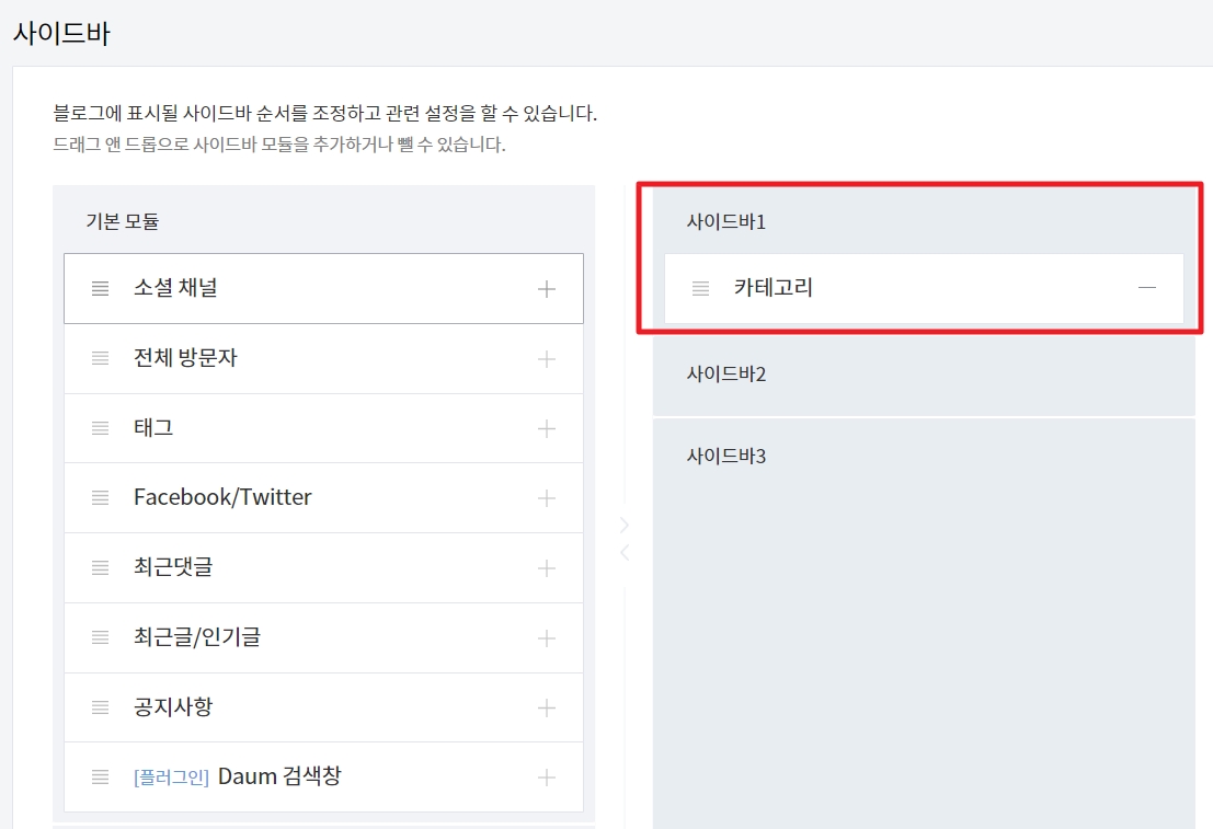 >>> 사이드바에서는 다른 항목은 ㅂㄹ필요하므로 "-" 표시로 삭제해 주시고 카테고리만 남겨 두시면 됩니다.
