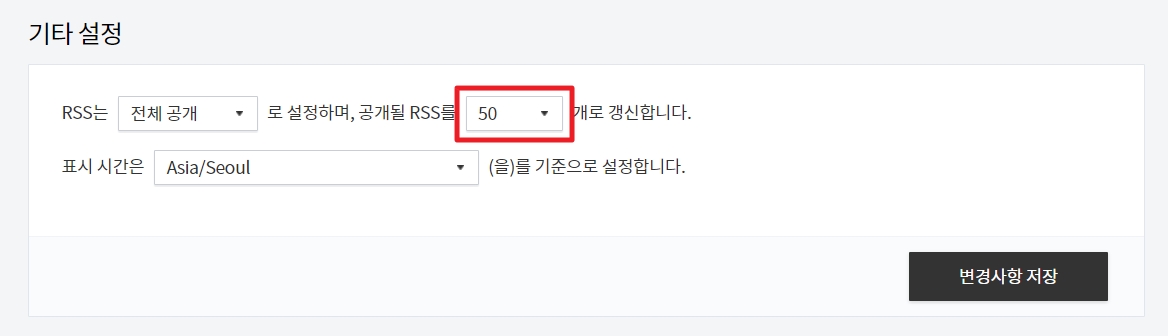 >>> 좀 더 아래로 내려가면 기타 설정에서 RSS는 전체 공개로 설정하며, 공개될 RSS를 50개로 갱신합니다.