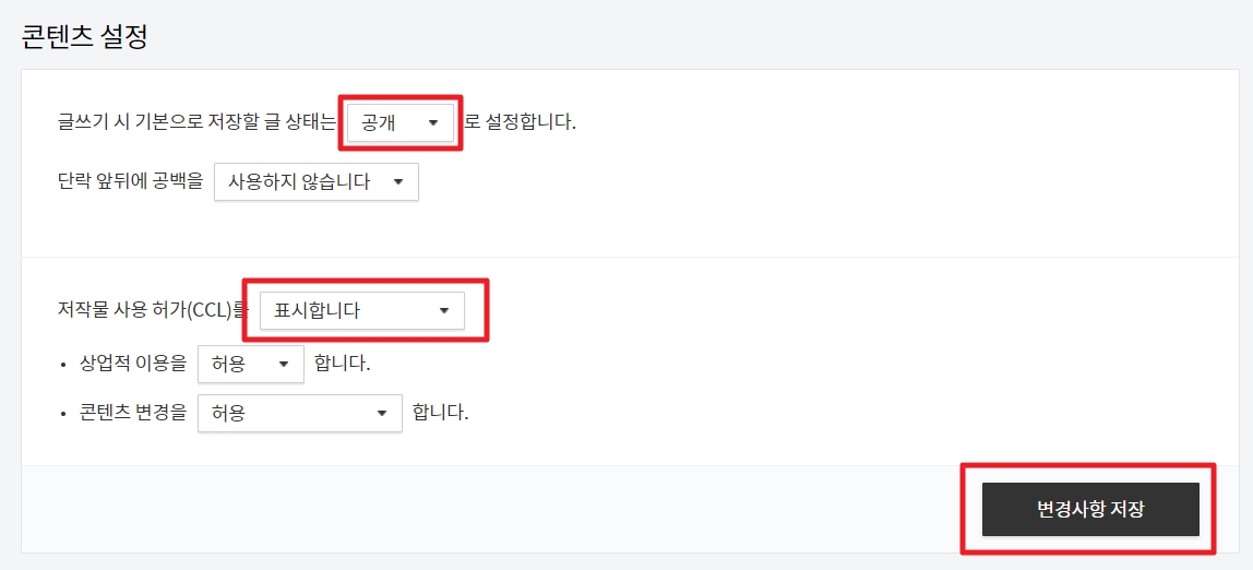 >>> 콘텐츠 설정에 들어가시면 빨간 상자 부분만 설정하면 됩니다.